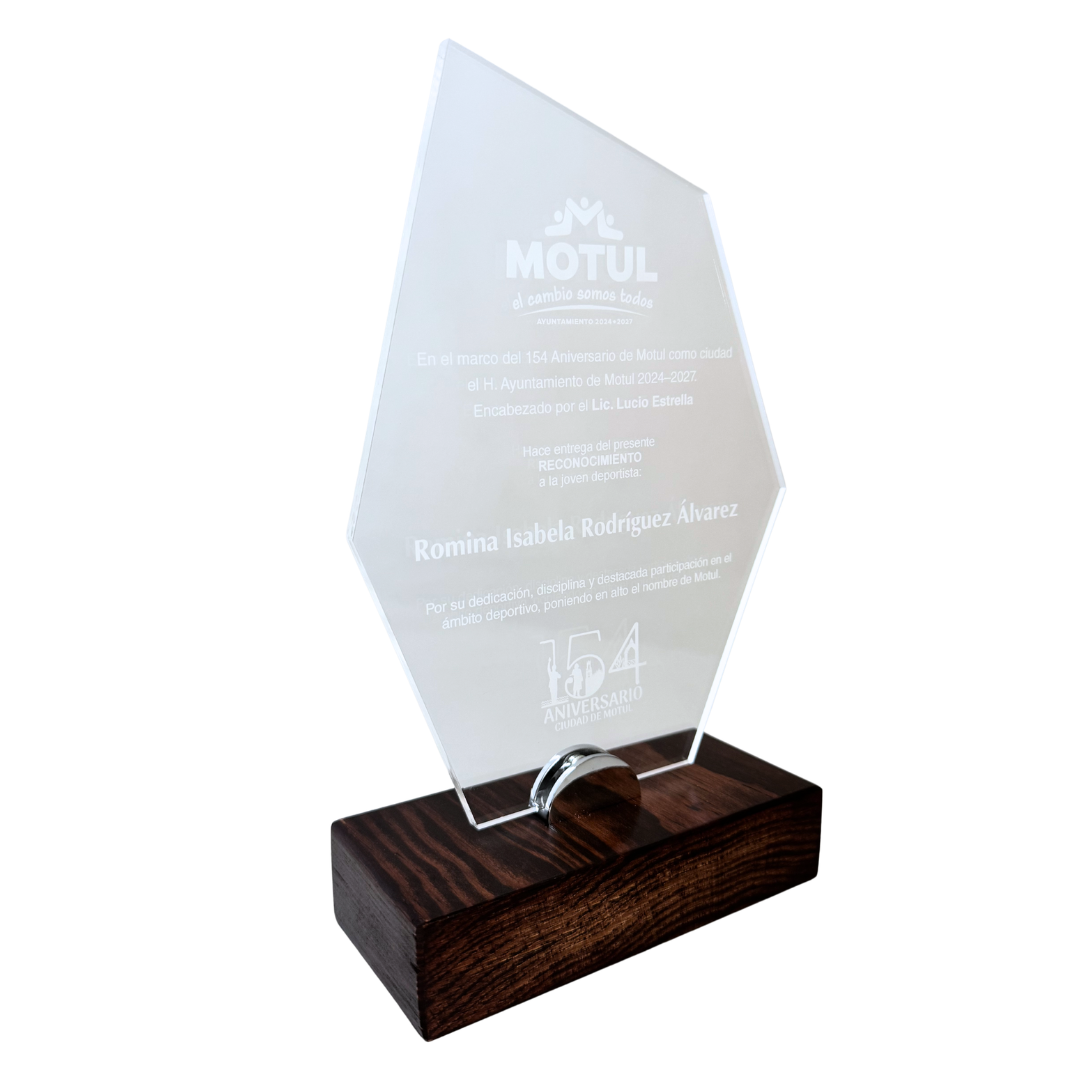 Base: La base es de madera y el acrílico se sujeta a la base con un herraje metálico. Es posible que la imagen muestre una base distinta.